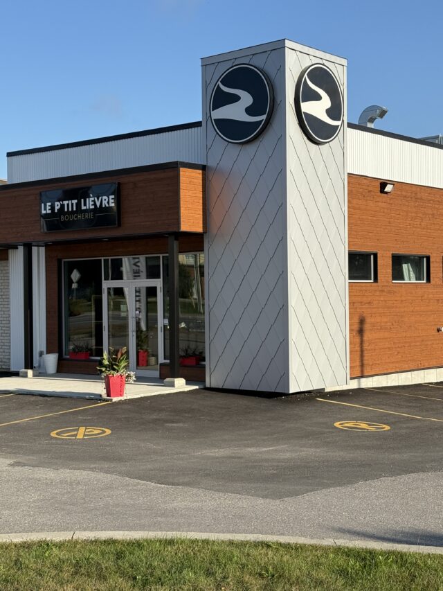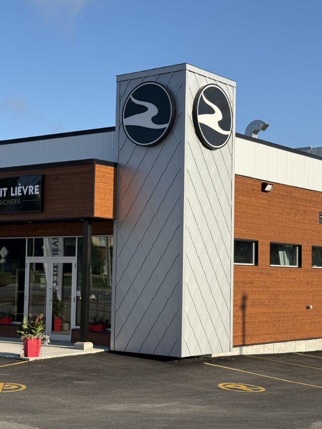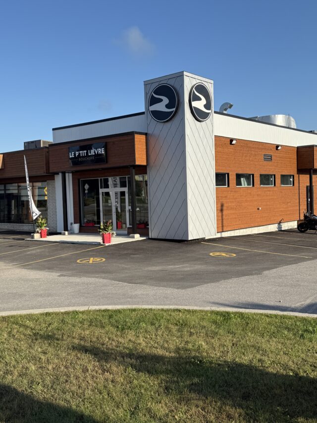 Expansion of the Microbrasserie du Lièvre at 131 Albiny-Paquette Boulevard The facades with 24-gauge Large Diamond 4-ply Steel tiles in Metallic Gray (QC7500). Project by GBA Architectes. Installation contractor: Altitude toiture revêtement .