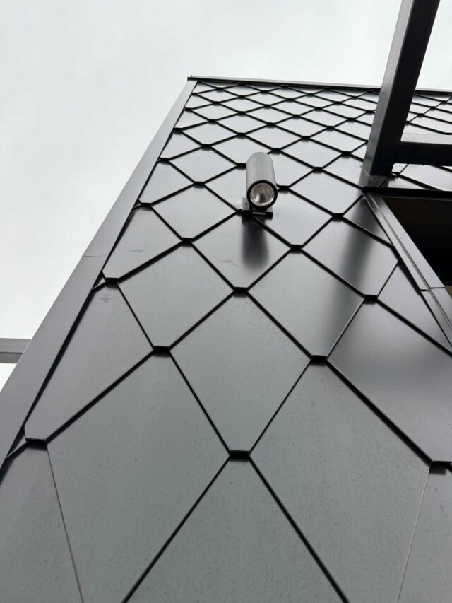 Diamond tile medium size wall, Steel caliber 24, Prespectra Black  on horizontal metal furring